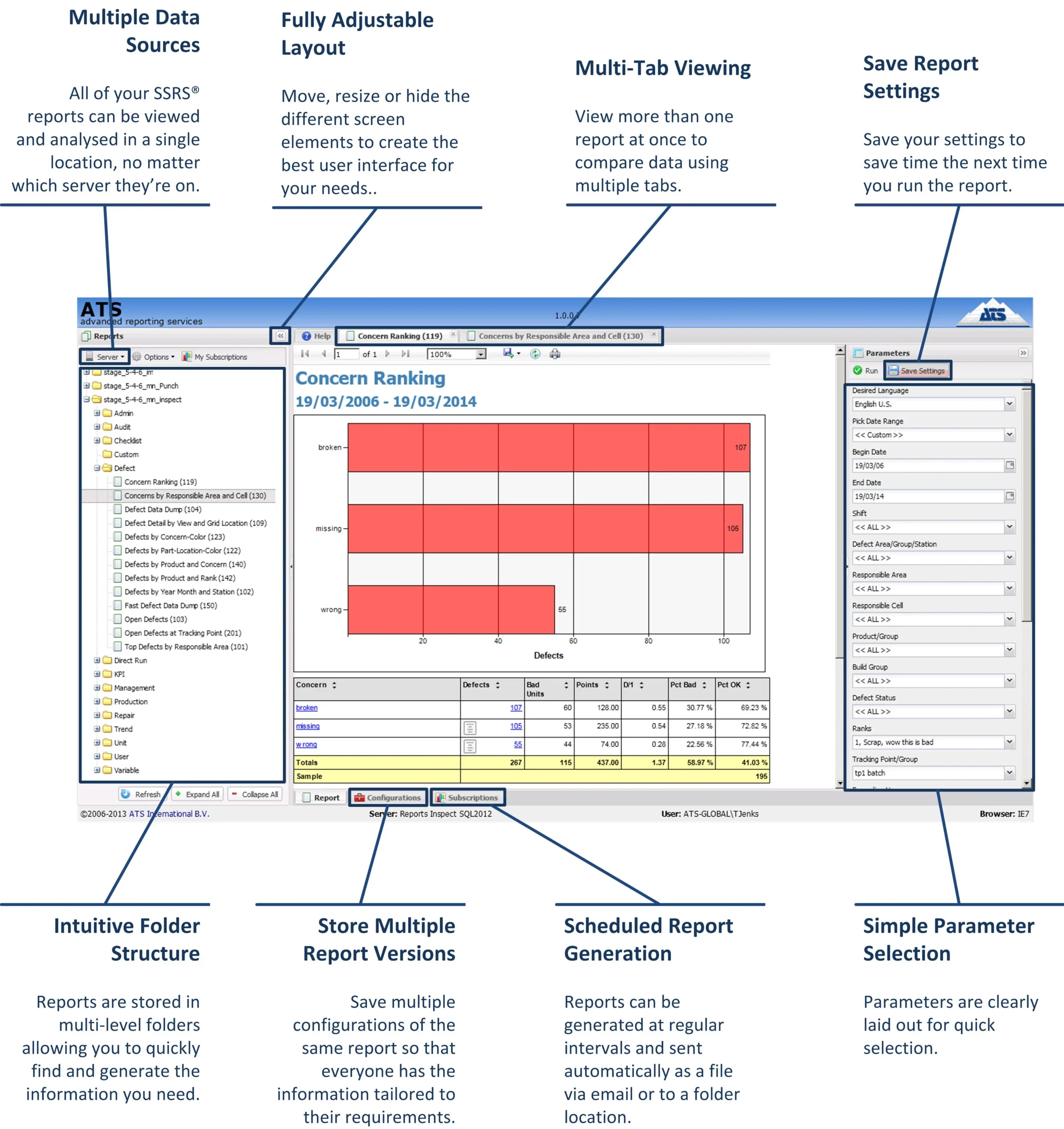 The user interface gives you quick, intuitive access to all of the existing SSRS® capabilities as well as the many additional functions supplied by ATS Reporting Services. Selecting, generating, sending and saving customized reports is now just a few clicks away.